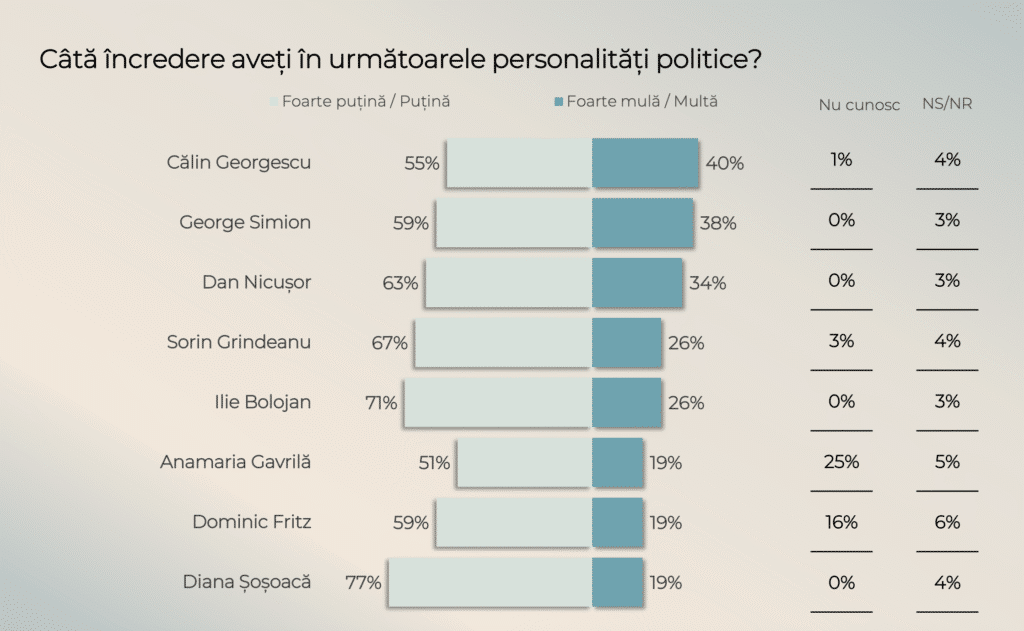 Potrivit sondajului CURS, Călin Georgescu se află la 40% încredere, în timp ce George Simion la 38%. Pe locul 3 este președintele României, Nicușor Dan. Printre politicienii cu cel mai mic grad de încredere în rândul populației se află Diana Șoșoacă și Dominic Fritz.